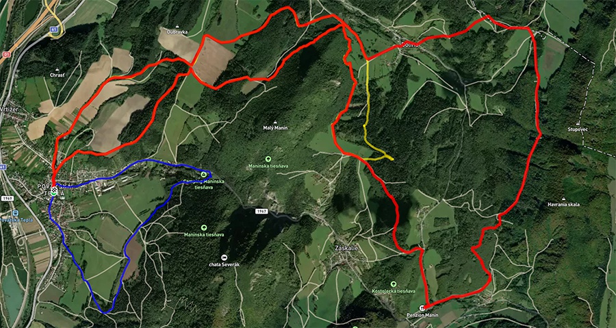 vpravo cez obec, popod Malý Manín, ponad osadu Bazalia – kontrola K1. Trasa pokračuje vpravo lesnou cestou cez Vajánok do Kostolca k bývalej Základnej škole a k pamätníku národného umelca Petra Jilemnického, kontrola – K2. Pokračuje kúsok asfaltovou cestou smer Vrchteplá, odbočí vľavo na lesnú cestu, poza Háj. Ďalej poľnou cestou ku krížu nad Plevník-Drienové Dolina – kontrola K3. Potom poľnou cestou, prekríži cestu Plevník-Drienové Dolina, pokračuje vpravo druhou cestou okolo Malého Manína. Prechádza popod Dúbravy, poľnou cestou do cieľa pri Základnej škole s Materskou školou v Považskej Teplej.